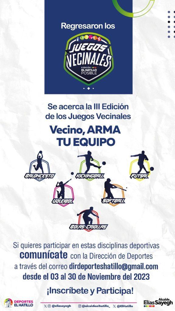 El Hatillo, 24 de octubre de 2023.- Con el firme propósito de continuar como pioneros del deporte municipal, como forma de impulsar la cohesión social, la unión y la sana convivencia, se inicia la convocatoria de la III Edición de los Juegos Vecinales El Hatillo 2023, que se realizarán en noviembre. Gracias a las políticas públicas y a alianzas público-privadas se creó un espacio de intercambio deportivo, el cual se convirtió en un ejemplo de fraternidad, organización y trabajo en equipo.