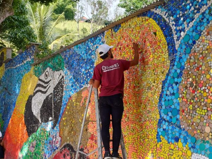 El Ökomural, ubicado en la Plaza Escalona de El Hatillo, fue realizado con tapas de plástico recicladas en el 2019. Debido al paso del tiempo y a la interacción con el público, el mural necesitaba de mantenimiento, por lo que durante esta semana se sustituyeron algunas tapas, se pintaron las que estaban desgastadas y se le aplico un recubrimiento especial para que la obra se mantenga conservada por muchos años más.