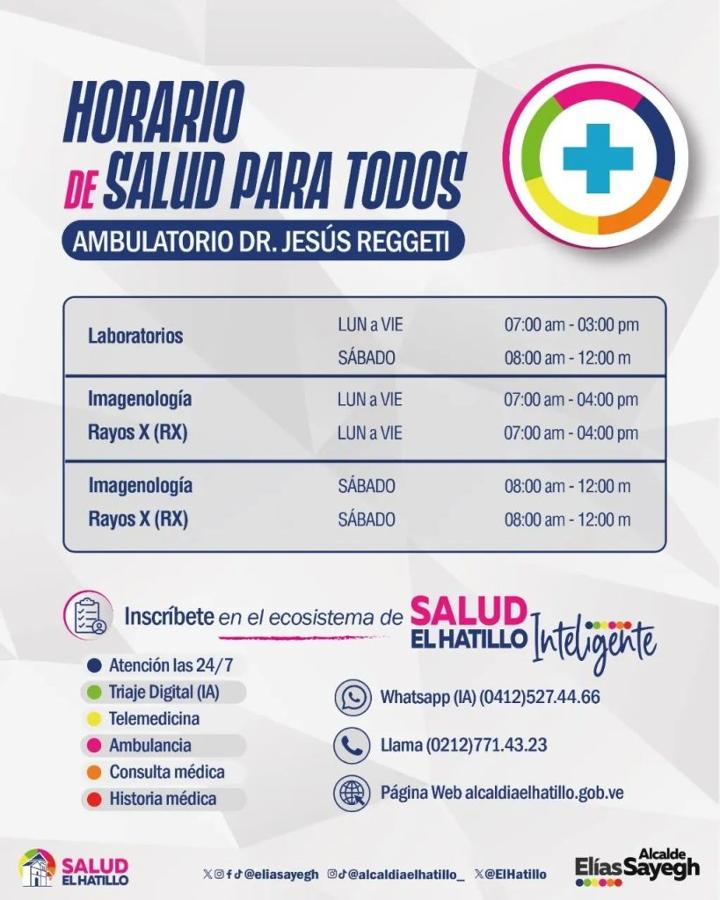 Para la gestión municipal cuidar de la salud de los ciudadanos es una prioridad, por eso en El Hatillo está el Ambulatorio Dr. Jesús Reggeti, que cuenta con todos los servicios de emergencias básicos, así como consultas especializadas en ginecología, traumatología, psiquiatría, pediatría, medicina interna, cardiología, obstetricia, mastología y oncología. Para ser beneficiario de estas consultas deben asistir con cita previa, con la excepción de medicina general.
